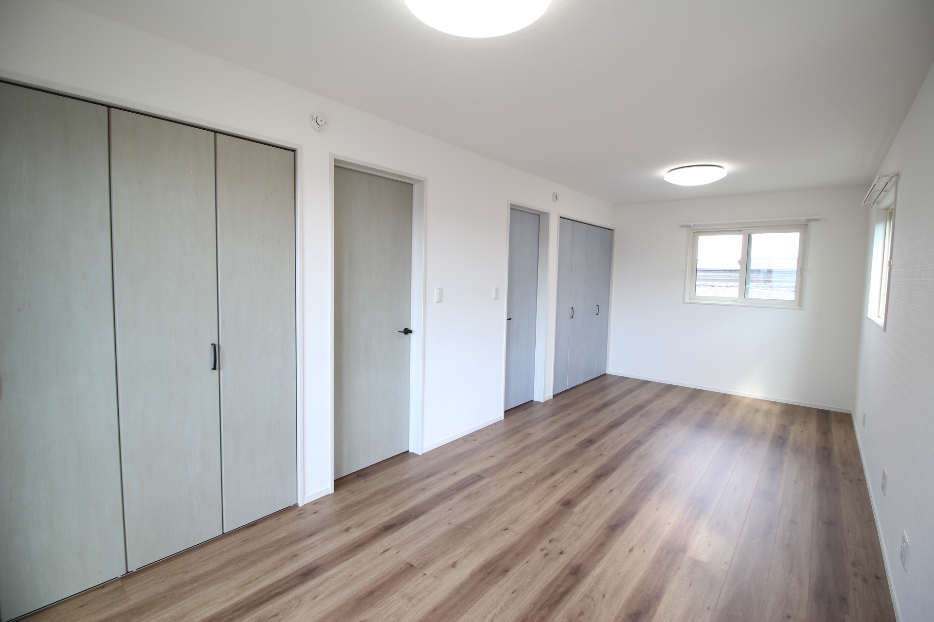 濃い目のブラウンが目を引くカッコいい外観にサッシ枠をホワイトにしたことでかわいらしさもあるおしゃれなお家に仕上がりました。お部屋の中も濃い目のフローリング(リクシル:ナチュラルオーク)に建具は木目のあるホワイトオークで統一されていて落ち着く空間です。